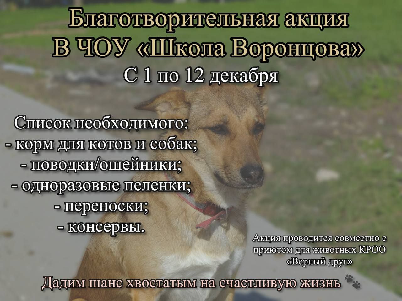 В нашей школе с 1 по 12 декабря будет проходить «Неделя благотворительности» в помощь бездомным животным из приюта и животных, пострадавшим от рук человека.